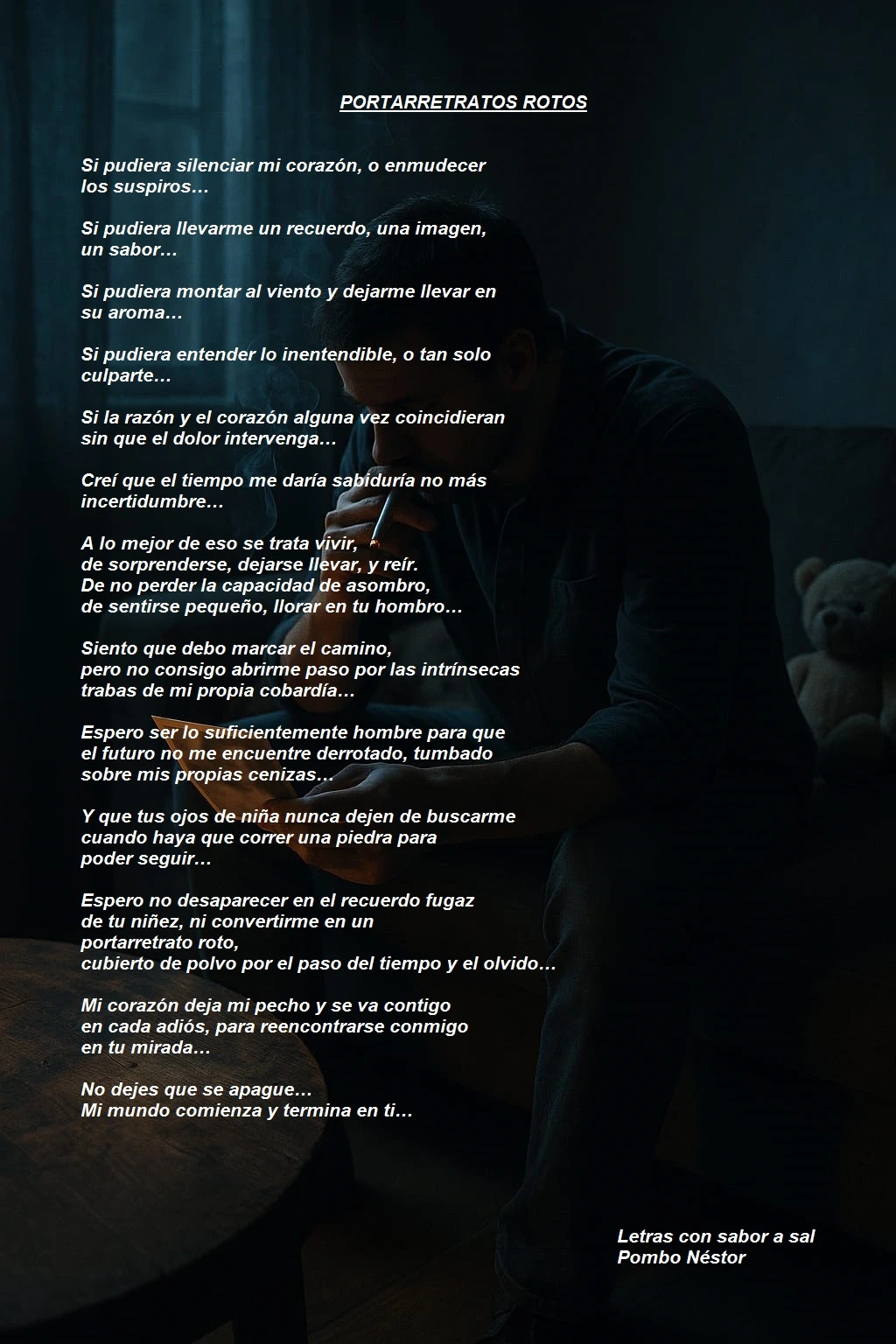Imagen del protagonista hundido en el recuerdo con el poema completo.